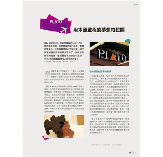 用木頭啟程的夢想柏拉圖—PLATO 文◎陳佩幸攝影◎許睿詅成立於2004年的泰國設計公司PLATO,雖然還很年輕,但它簡潔的設計語言、豐富的想像力、以及高質感的木工藝技術,卻已漸漸擄獲世界級的眼光注目了!走在設計觀察的前端,這回曼谷木設計的小旅行,PLATO無疑是最值得令人期待的新星!泰國最豐富的天然資源之一,樹木,滋養著泰國的生機、也讓當地人的無窮創意能盡情發揮,泰國本土設計師品牌PLATO的設計品,就是充分運用木材,完整呈現一系列的原汁原味木創作。而關於PLATO與木頭的故事,就要從1989年說起,當時,他們還是專為政府提供...