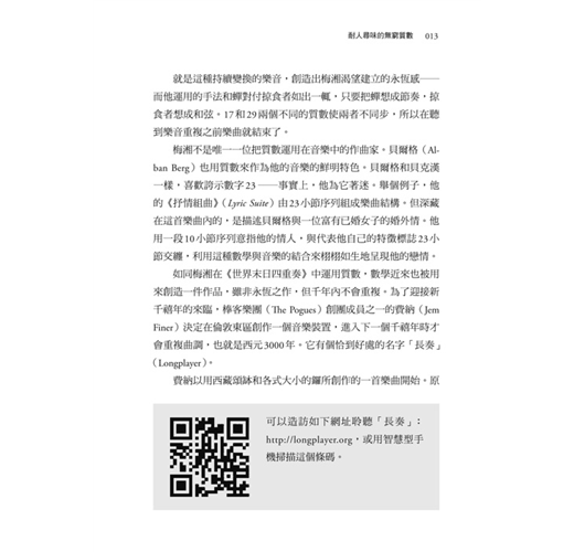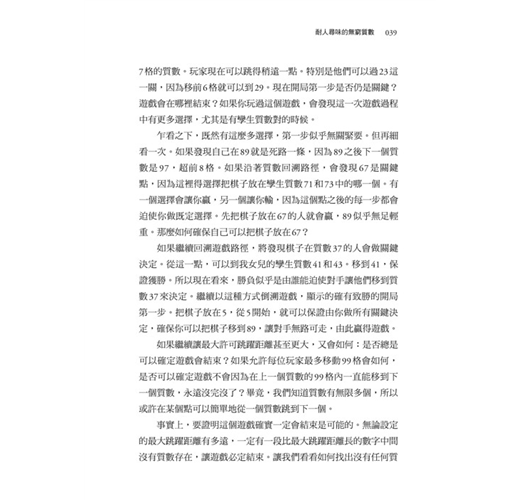 作者身兼數學家、足球員和業餘音樂家等數種身分,在書中生動地展現出隱藏於五大謎題背後的數學之美。書中有遊戲可玩、謎題可解,呈現的數學從簡單到困難都有: