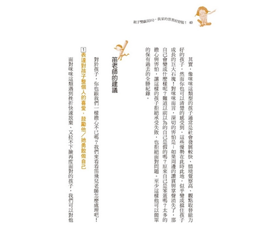 那一屆的東吳學生很優秀,我記得教的很愉快,畢業後,好幾位同學還有跟我保持聯絡,楊鈺瑩就是其中之一。心理系的學生畢業後,很多走臨床去醫院上班,但是楊鈺瑩不同,她和幾位志同道合的同學開設了「笛飛兒EQ教育」的班,從大腦的觀點來解釋兒童的行為,經營得有聲有色,現在已經有分部了。這本書就是她們這些年教孩子管理情緒的經驗,書中舉的例子很實在,又有獨特的EQ教育法,在「孩子皇帝大」的現代,很可以有效幫助父母處理一些孩子情緒等方面的問題。