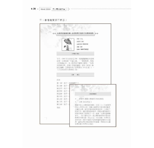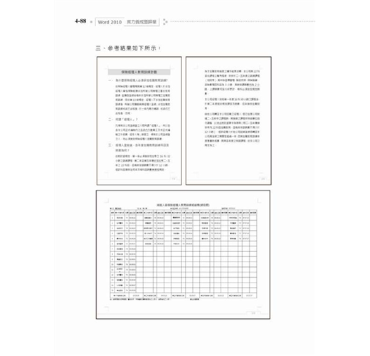 學科包含八大類,從Word 2010基本能力開始,訓練紮實的基礎操作;術科部分考驗考生的實作能力,從文件的建立開始,到字元與段落的處理、表格的製作、圖文並茂文件的設計、長文件的編輯,以及合併列印文件的設計等等,形成一個完整的學習歷程。本書結合在產業界及學界具有豐富教學經驗的教師及專家群共同開發,以「測驗」引導「教學」模式,術科各類由淺入深設計成10個題組,實現「做中學、學中做」的學習方式,有效地提升工作專業能力與效率。