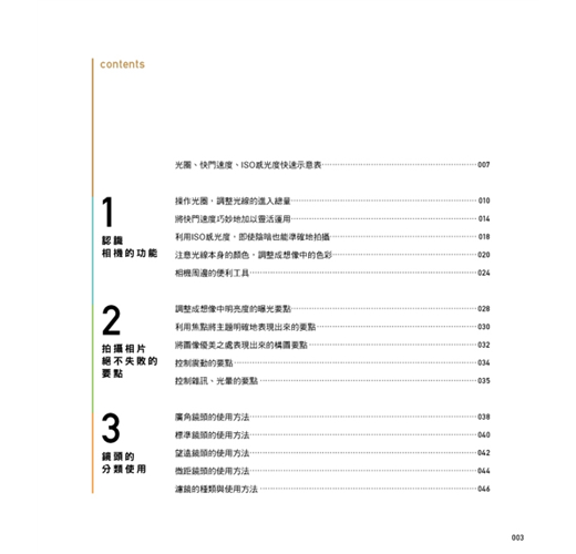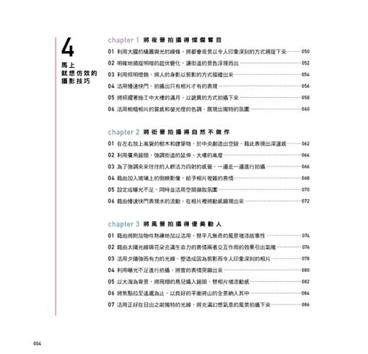 另外,充滿美感的相片之所以充滿美感,必定有其理由所在。在本書中,將以專業攝影師所拍攝的大量各式相片作為範例,為什麼這一張相片充滿美感?又或者此張相片是以什麼為目標拍攝而成的呢?將上述這些理由附註上去,一一為讀者做解說。如果可以理解這些說明,並且將之應用到自己的相片上的話,所有的讀者也一定都可以拍攝出充滿美感的相片。