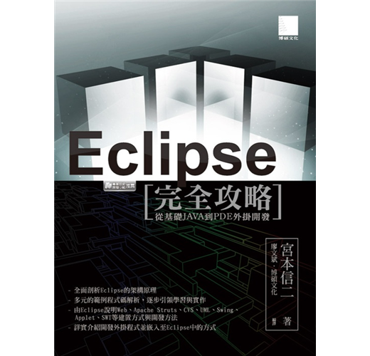 第1章解說Eclipse概要,並介紹開放原始碼的Eclipse之緣起與專案概略;第2章說明Eclipse的安裝方式和快速入門法,初次使用Eclipse的讀者請按照內容從頭跑一遍;第3章全面解說Eclipse的基本功能,雖然主要說明Java開發工具,但若深入研究,會讓您有意想不到的新發現;第4章將一邊實際製作範例應用程式,一邊介紹架構Web應用程式所需要的功能,從不可或缺的資料庫設定,到Apache Struts的用法都會一併解說;第5章介紹團隊開發功能,特別是CVS的用法,CVS也內建了SSH用戶端,讓只靠Eclipse完成一日開發的未來更接近了;第6章說明在Eclipse上使用JUnit進行測試、除錯的方式,程式碼附件、Web應用程式之除錯等相關項目也會說明;第7章介紹Ant的基礎和應用程式的建置方式;第8章針對在Eclipse上的UML建模和重構作重點說明;第9章介紹Swing、Applet、SWT應用程式的建立方式,並介紹Jigloo GUI Editor和GEF等開發工具;第10章講解開發外掛程式並嵌入至Eclipse中的方式,還會介紹RCP應用程式的建立方式。