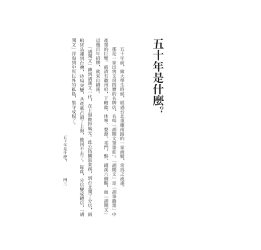 五十年過去了。胡適早已墓草久宿;「胡開文」也被銀行拍賣、倒店異鄉;胡漢文退而賣水果、賣台灣玉以死,一代文物,俱成雲煙。偶過重慶南路,渾忘當年曾有筆墨之莊於斯,既茫然無人指點舊跡,復惘然前塵不可復識,以渾忘出之,正所以結之也。