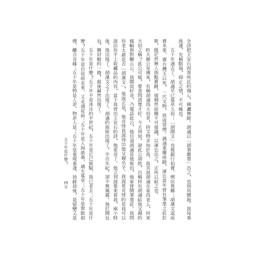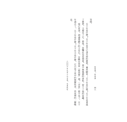 現已夜深,胡適墨蹟下的王安石,安睡在我家「最高層」裡,「浮雲」都不見了。五十年過去了,五十年是什麼?五十年不是什麼,它只是子夜中的無聲欣喜、長夜裡的一聲嘆息。