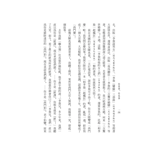 其實,從笑談觀點看,李敖在大陸的「淫威」,遠比台灣風光得多。大陸除了冒李敖之名,出版「李敖談男女」(時代文藝出版社)、「李敖『變臉』三部曲」(陝西旅遊出版社)等假書大談情色外,還現身說法,出版「我為卿狂—李敖的三次驚世婚戀」(北方文藝出版社)等書,也極盡加油加醬胡說八道之能事。光看書名就領教了,我只結過兩次婚,何來「三次驚世婚戀」?不過,這類「李敖和他的女人們」(台海出版社)的書,還算客氣的,比起「和李敖一起瘋狂」(內蒙古文化出版社)一類的書來,你就恍然大悟了。 我在美國的好友陳兆基,一天打電話來,說你李敖可不得了啦,你在大陸變成「西門慶」啦!我笑問怎麼回事?他說大陸出了一本「和李敖一起瘋狂」的書,亂寫一通,把你寫成了一個大淫蟲、大淫棍啦,我寄給你見識見識,認識你老兄幾十年,沒想到你居然變成了「西門慶」!