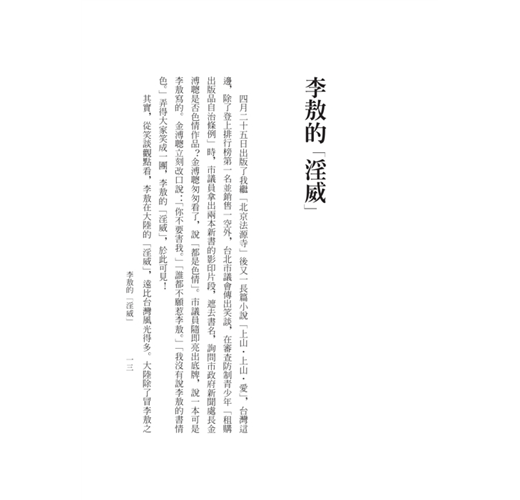 李敖的「淫威」四月二十五日出版了我繼「北京法源寺」後又一長篇小說「上山•上山•愛」,台灣這邊,除了登上排行榜第一名並銷售一空外,台北市議會傳出笑談,在審查防制青少年「租購出版品自治條例」時,市議員拿出兩本新書的影印片段,遮去書名,詢問市政府新聞處長金溥聰是否色情作品?金溥聰匆匆看了,說「都是色情」。市議員隨即亮出底牌,說一本可是李敖寫的。金溥聰立刻改口說:「你不要害我。」「誰都不願惹李敖。」「我沒有說李敖的書情色。」弄得大家笑成一團,李敖的「淫威」,於此可見! 其實,從笑談觀點看,李敖在大陸的...