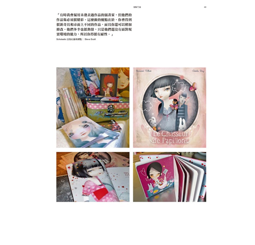 「我會接到許多毛遂自薦的電話與Email,還會收到各種形式大小的郵寄作品,但其中許多並不適合我們公司。我也會接到一些對我們的雜誌沒什麼研究的插畫家來電,他們連公司地址都不知道!我確實會期待大家先做點基本功課,先瞭解我們雜誌的插畫風格與內容。」