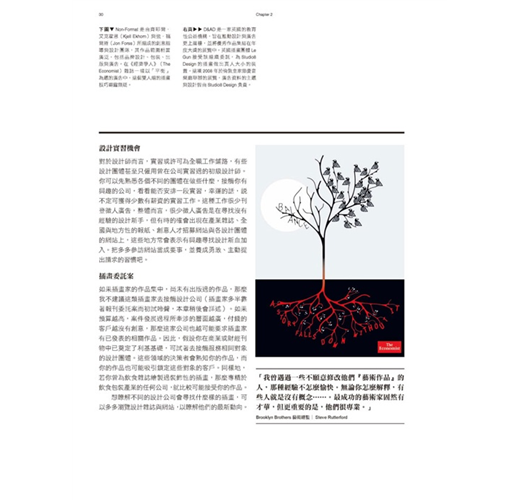 緊接著,作者以最常使用作品集的平面設計(graphic design)和插畫(illustration)兩大行業別為例,提出兩者專業本質的差異點和工作模式的特性,並論及兩大類型求職者的相對適性及做作品集時應有的權衡考量。作者更以其專業插畫家經紀人的親身經驗,以本人經手的創作者與客戶之間的互動實例,指出平面設計的作品集,多少還容許求職者展示多元創作的表現形式;但插畫類型的作品集,就應該集中在一個,最多不超過兩種樣式,三種以上的插畫表現樣式,不只混淆市場對插畫家的專業意象,甚至會顯露創作者對自己的作品缺乏信心。像這些必須縱觀全局又要細項區辨的專業認知,絕對不是未涉設計市場和初入設計職場的設計新人可以理解和想像的。
