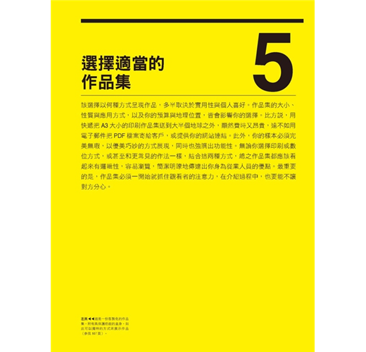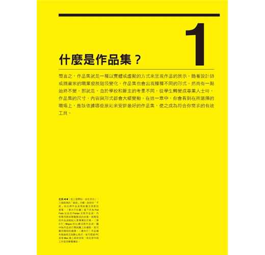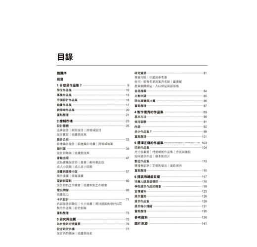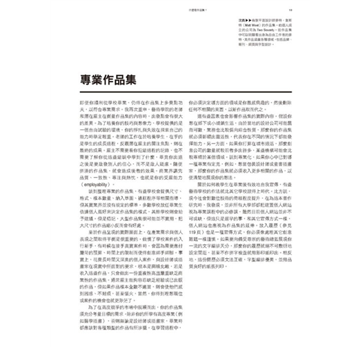 作者一開始簡約地說明何謂「作品集」之後,馬上切入主題,把作品集分為「學生作品集」和「專業作品集」兩大類型:前者是申請設計學校和在校生到外面找實習機會,後者適用於新人找工作或在職者昇遷換跑道。這兩大類型的作品集針對的對象不同,作品集審閱者的心態也不一樣,裏頭的東西和呈現的方式當然也要有所不同。搞錯對象,牛頭不對馬嘴,再美麗的作品集,也只是一個美麗的錯誤。