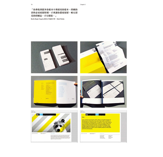 讀者在閱讀本文吸收作者完整知識的灌輸之外,還可以在隨處穿插的訪談摘錄裏,聆聽不同專業人士的各種說詞和看法;對每個章節的主旨意涵,可以有縱向的深入認知,更有橫向的豐富闡釋體會。而且,除了知識觀念的灌輸和實務規則的陳述之外,作者其實也花了許多心思在作品集的製作技術和表現創意的介紹。雖然重點還是這些技術和創意背後的知識觀念,每個章節配置相關作品集類型的插圖表現和簡要說明,可以讓讀者透過這些具體圖例,檢視不同專業的設計人,如何在不同的表現形式下呈現作品集的普遍意涵,並滿足不同設計類型的作品集製作考量與技術需求。