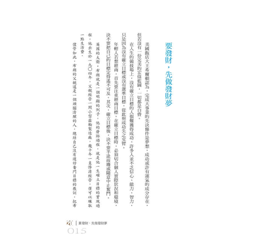 ■ 人與人之間的差別並不大,重要的是要有致富的夢想,然後積極的運用一切資源,讓你的大腦發揮到極致,承住所有的挫折與困難,這樣,還有什麼夢想不能實現?