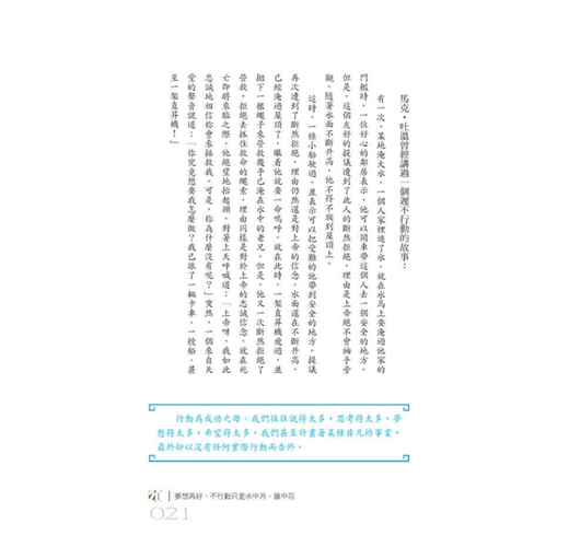 成功和失敗只有一線之隔,不經意中我們就會跨過界線。我們常常站在界線上,自己卻渾然不知。多少人只要他們再付出一點努力,再多一點耐心,就會獲得成功,而在緊要關頭他們卻無可奈何地放棄了,以至於最終一事無成。
