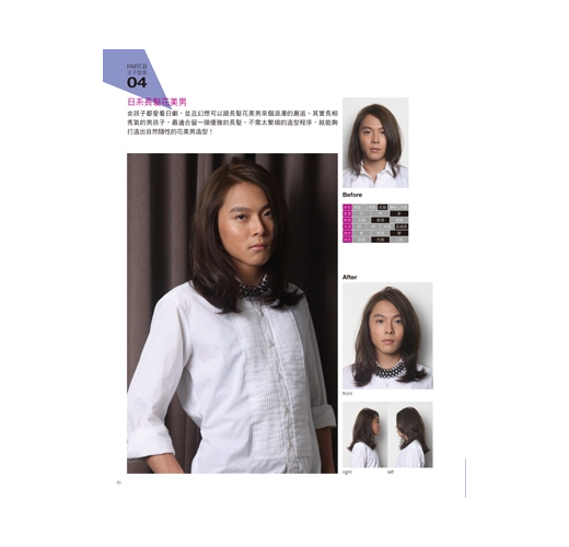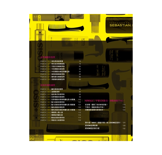 整本書的製作過程,經過了無數次的修改才與編輯達成共識,雖然拍照過程是開心的,不過截稿日期確實造成我每天上演恐慌症的戲碼,身旁的同事也只能乾瞪眼,不知道能夠幫我什麼忙。我願意出這本工具書,真正的用意在於爲ZOOM HAIR創造一個新的里程碑!我待過許多SALON(沙龍),也見證許多SALON的興衰,由衷的認為要將一家有質感的SALON經營得有聲有色是一件極為困難的事。因爲美髮沙龍各行業的資產是「人」,這比販賣任何其他的產品都還困難得多!