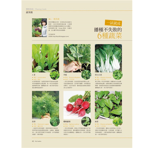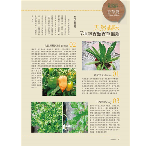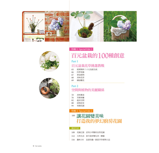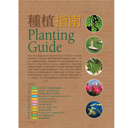 本期種植指南,要介紹給讀者迎接美麗花季的經典玫瑰、天然調味辛香類香草、令人目眩神迷的彩虹草、秋天雜木盆栽習作、防治病蟲害的藥劑挑選法,及不失敗的新手種菜密技。