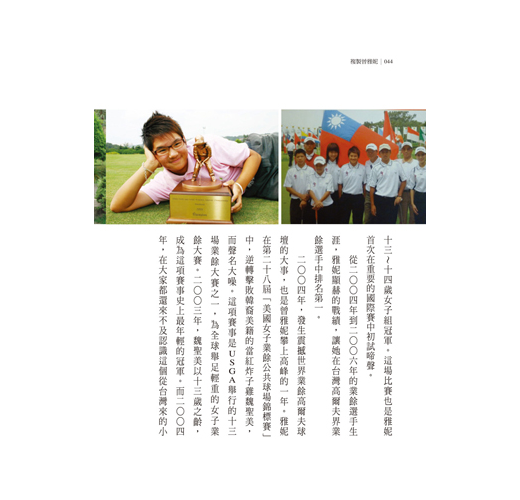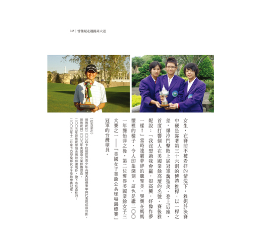 曾雅妮走過揚昇大道 到底是什麼樣的因緣,「台灣出現了世界女子高爾夫冠軍?」這本書並無法回答這個這麼困難的問題。「複製」兩個字所想表達的卻是,希望一窺曾雅妮的艱苦訓練過程所走過的道路,還有在同樣的路上,台灣還有沒有機會繼續讓許多「曾雅妮」走向世界,繼續閃閃發亮。 這個章節,主要是談曾雅妮的出現以及她的人生階梯,與在這個階梯不同時空幫助她的人士。二○一一年九月十日,曾雅妮的父親曾茂炘回到了揚昇球場,與許典雅董事長敘舊。剛好有機會大家一起回顧曾雅妮的來時路。從童年到青少年,從家裡的遊樂訓練場到揚昇...