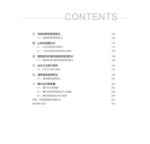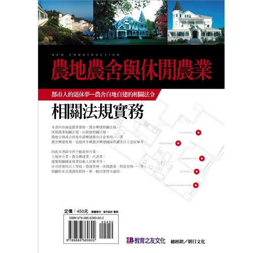 本書內容涵蓋農業發展、農舍興建相關法規、休閒農業相關法規、山坡地相關法規、農地分割或合併後申請興建農舍注意事項……等農舍興建實務,也提供多種農舍興建圖面供讀者自立造屋參考。因此本書除可供不動產仲介業、土地仲介業、農舍興建業、代書業、建築相關國家專業技術人員參考外,亦可供專科以上學校,營建管理、休閒農業、物產管理……等相關科系法規課程教材,與一般民眾皆可適用。