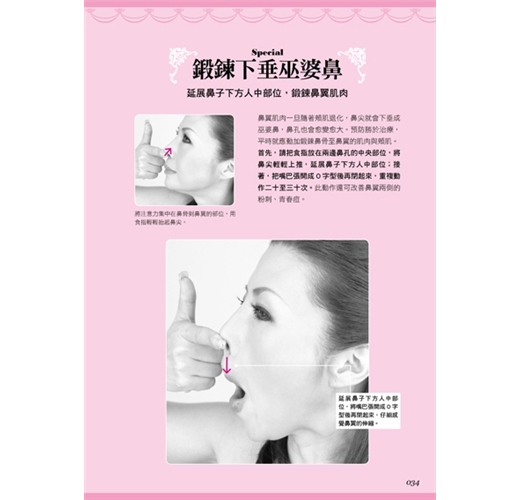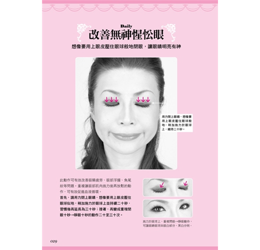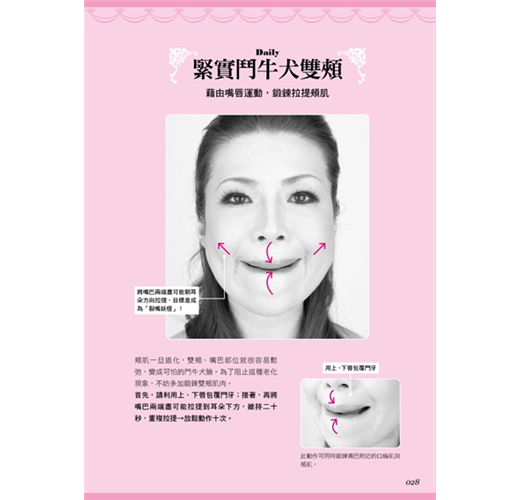 鼓起臉頰,使口腔內部充滿空氣;接著將空氣吸入,使雙頰凹陷,重複20次,就能讓臉部呈現自然粉紅嫩色,特別推薦給因偏食或肥胖,導致輪廓線條不明顯的人。