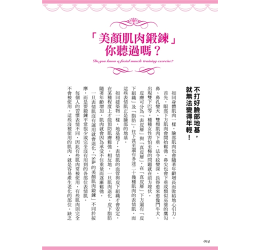 ˙以美國「臉部訓練」為基礎,根據東方人骨骼構造,獨創「美顏肌肉鍛鍊」,雕塑臉部線條,迅速解決斑點、暗沉、鬆弛、細紋等肌膚困擾。