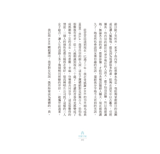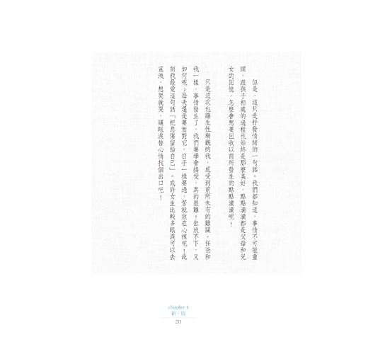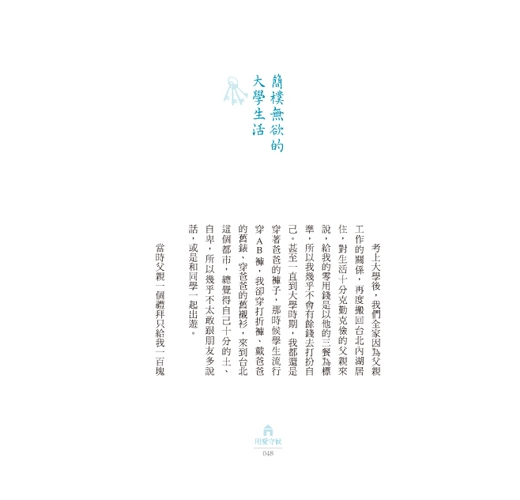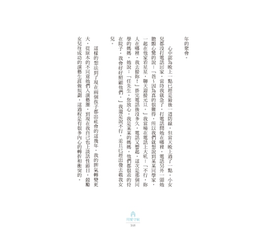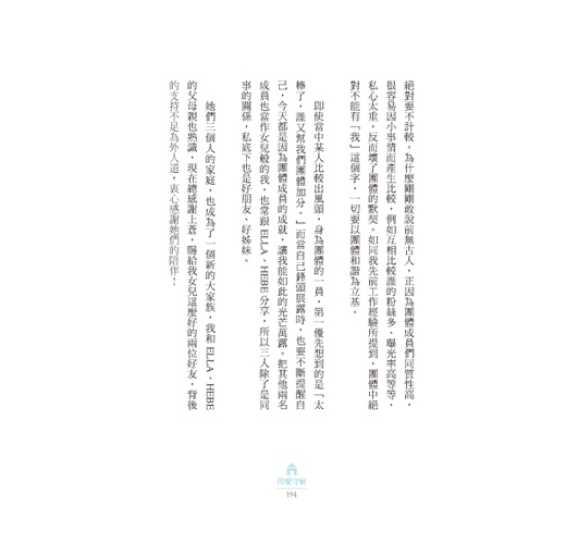 深感謙卑、淡泊名利的重要性,我也常跟女兒說,妳絕對不能與人爭,爭名奪利的人會失去所有的東西,也將失去那顆最善良的心。書中不斷反省我教養過程的優與劣,在回想過往教育經驗時,我跟所有愛子女的父親們一樣、捨不得放手,高壓的控管讓女兒的心漸漸離我遠去;在失去的同時,學習面對放手,反而恢復了以往親子間的良好關係。