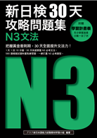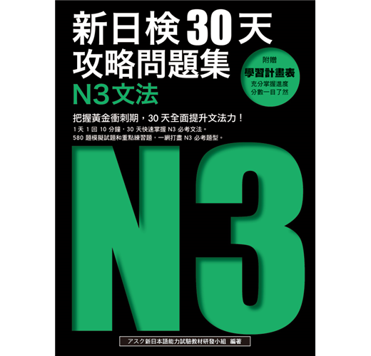 《新日檢30天攻略問題集:N3文法》是日本專業語言教材出版社アスク針對新日本語能力試驗N3的「文法」項目所編寫的問題集,全書收錄580道題目,包括480題模擬試題和100題重點練習題。題目採30回測驗設計,一天一回,分量剛好,目標作答時間10分鐘,效率最高。只要一個月,輕輕鬆鬆提升N1文法力。