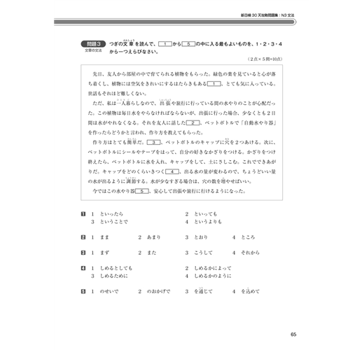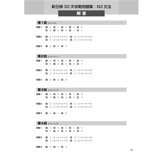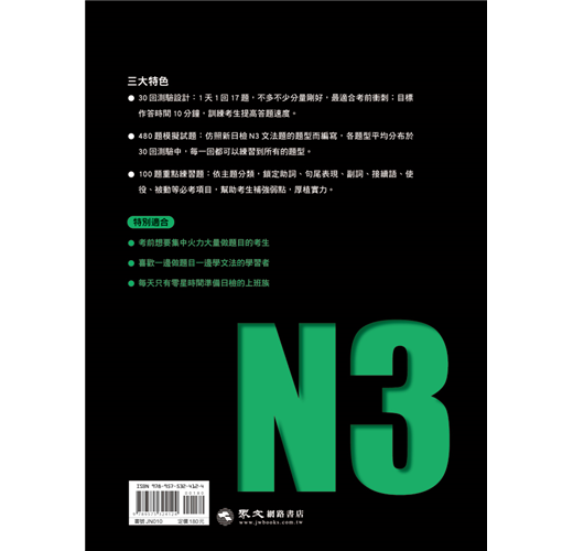 ● 480題模擬試題:仿照新日檢N3文法題的題型而編寫,各題型平均分布於30回測驗中,每一回都可以練習到所有的題型。