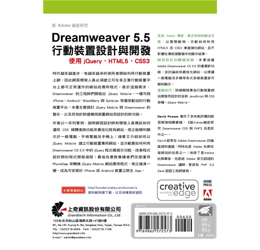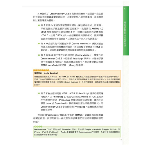 * 網頁設計的關鍵訣竅:本書涵蓋 Adobe Dreamweaver CS 5.5 的重要新功能,並討論如何最佳化網站,以便讓一般電腦及手機等各式各樣裝置皆可順利顯示。