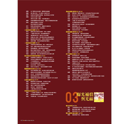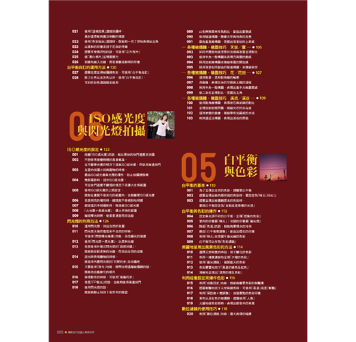 看過之後,您將能夠徹底瞭解「光圈與散景」、「快門速度與模糊的表現」、「曝光補償與光線」、「構圖與鏡頭運用」、「白平衡與色彩」以及「ISO感光度與閃光燈拍攝」的各種進階拍攝技能!