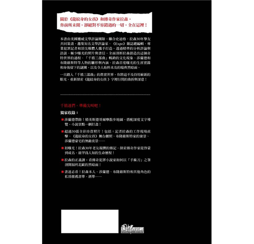 名人推薦:★《龍紋身女孩的秘密》在原著小說和電影之外,給了我另一種思考面向。如果你想了解小說幕後的故事,絕對推薦這本。讀完它,「千禧系列」感覺又更好看了!──美國讀者 羅斯金
