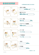 先想一想這句話的日文該怎麼說,想定之後,接著翻到內頁核對日文解答。比較自己想的及正解有哪裡不一樣,從這種訓練中,你可以慢慢習慣培養出正確的日文能力。核對的同時仔細反覆讀、播放MP3用心的聽並大聲的唸,最後回到前頁框格中動筆書寫,填入正確的答案,加深在腦海中的印象。此外,每課最後一頁安插有本畫的動作表現填空題,這不是嚴格的考試,動筆複習讓自己學得更有價值。