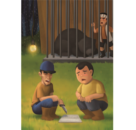 為了要救黑熊,沙夏決定正面迎戰敵人,然而他身上帶的武器不是獵槍,而是「數學習作」、「咬人八」和一頭「小都瑪」!