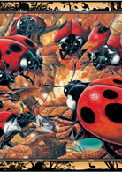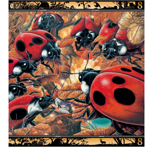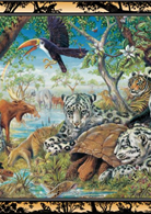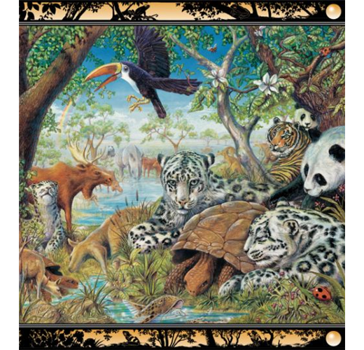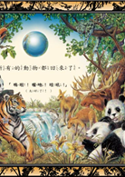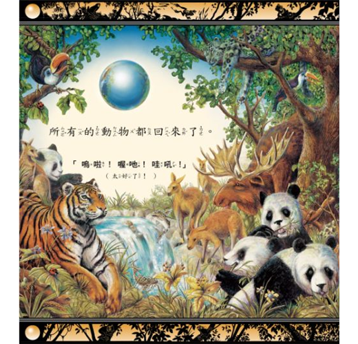 接著,仔細欣賞作者的彩繪圖畫,每一幅圖畫都有一個主題區域,例如非洲、溪流、中國、澳洲等。每一頁的構圖,畫中有畫,暗藏這些區域的十種主要動物,考驗著讀者們的眼力,努力搜尋畫面中的各個角落和圖形,就會發出會心一笑,佩服作者巧妙的構思與安排。你知道一幅圖畫中有幾隻動物嗎?答案是 21 隻。最後,在所有動物都離開的畫面中,隱含的十隻動物,卻都是已經滅絕的物種,如渡渡鳥(1662 年滅絕)、旅鴿(1914 年滅絕)、袋狼(1936 年滅絕)等。