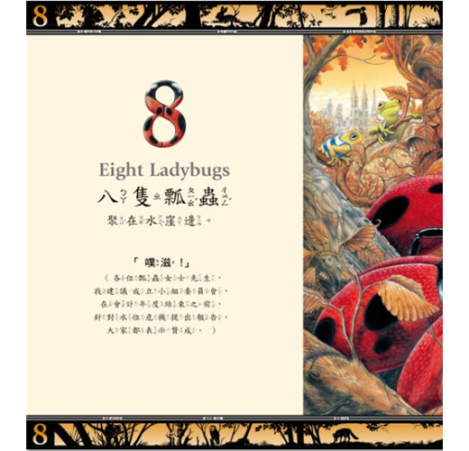 這是一本很有趣的圖畫書,少少的幾行文字,卻結合了數字邏輯、動物型態、生態保育、季節變化、謎樣拼圖、繪畫藝術等多功能。翻書閱讀時,我們會發現整本書的編排,由數字 1 到 10,動物數量愈來愈多,而水的面積卻愈來愈小,最後水沒有了,所有的動物都離開了。每一幅圖畫中都有主要配角「青蛙」,剛開始悠閒快樂的模樣,然後數量愈來愈少,最後也黯然離開,隱喻生物的榮景與水資源的消長關係。