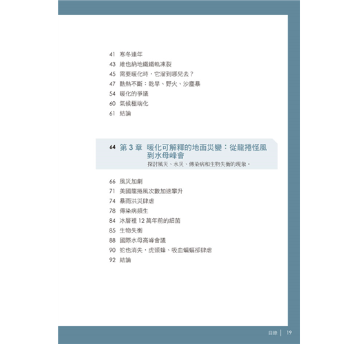 名人推薦:在這本書裡,從太陽輻射、大氣層、地表,貫穿到地下、地底,完整的探討氣候變遷的成因與衝擊。地上加地下,大氣連宇宙,建構出氣候變遷的全面書寫。我認識林中斌多年,他的研究背景,從地質地理跨界到企業管理和國際關係;他的治學態度扎實而周延,總能由細節中勘踏學理,從幽微裡爬梳脈絡。這樣的全面書寫,只有他做得到、做得完整。---中央大學通識教育中心教授 李河清
