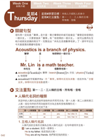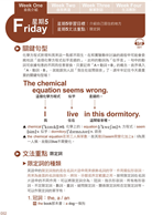全書共分成四週,分別有不同的學習重點,第一週為「自我介紹」、第二週為「自我表達」、第三週為「簡單對話」、第四週為「生活應對」。另外每週皆以不同的理科專業為主題,依序分別為:理學院、生命科學院、工學院、資訊學院。