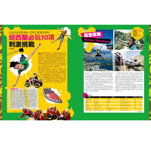來到紐西蘭,光是看看風景拍拍照,絕對不是標準玩法。紐西蘭的美,不是當作對象欣賞便已足夠,它不希望與人們有所距離,因此你必須以各種方式走進風景之中,換句話說,遊覽紐西蘭的最佳方式,就是報名當地的冒險行程。不過,這裡先來勤前教育一下,參加行程之前,最好先把自己的保守、矜持、膽怯通通鎖進置物櫃裡,然後和紐西蘭人一樣帶著大無畏的瘋狂換上裝備,因為你有可能即將從峽谷邊上一躍而下,或是從1萬2千公尺的高空墜落,或是在漆黑的溶洞中漂流,或是划著獨木舟出海;別忘了,高空彈跳這玩意兒,就是被這群kiwi發揚光大的。雖然聽起來有點自討苦吃,但你會發現用這些方式來親近的紐西蘭,帶有一種超越視覺的美感,它可以衍生出不同的角度,創造出不同的態度;這種經驗附著了驕傲,蔓生了喜悅,將旅程由平面趨向立體,由泛眾轉為獨特。