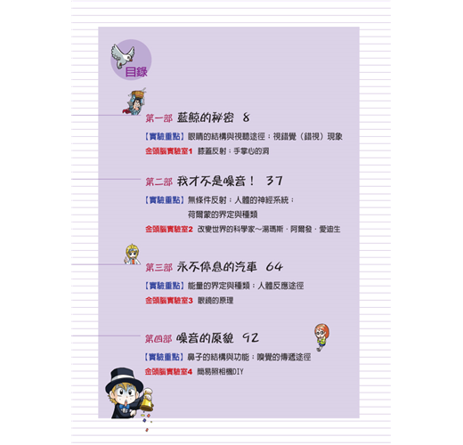 透過大腦所產生的錯覺現象,了解眼睛、耳朵、舌頭和皮膚等感覺器官的結構和功能,以及神經系統的運作機制,進而探究刺激與反應等各項人體中的科學原理。