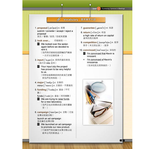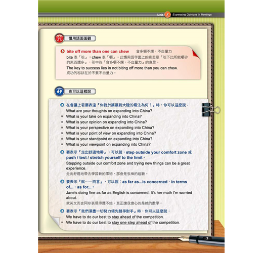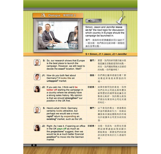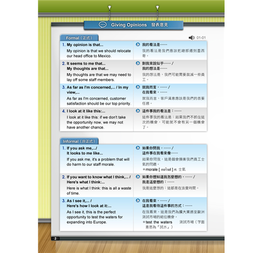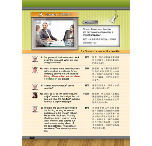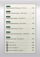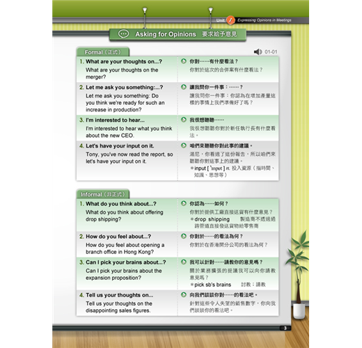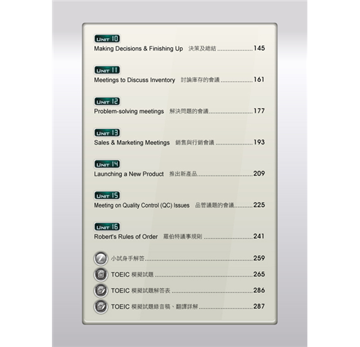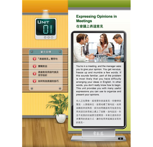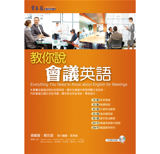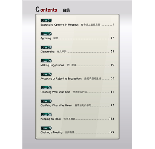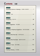 本書依據國人在職場會議上的需求,針對常見情境進行編撰。內容共計16個單元。每個單元都是會議必備主題:『在會議上表達意見』、『同意』、『意見不同』、『提出建議』、『接受或拒絕建議』、『澄清所說的話』、『釐清前句的意思』、『保持不離題』、『主持會議』、『決策及總結』、『討論庫存的會議』、『解決問題的會議』、『銷售與行銷會議』、『推出新產品』、『品管議題的會議』、『羅伯特議事規則』。