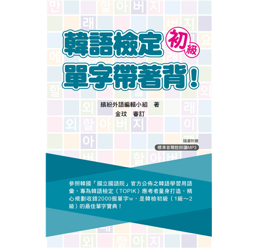 韓語初級程度必須具備約2000個單字(1級約800字,2級為1500~2000字),可以進行日常生活的對話、書寫簡單的文章(詳細請參照P.4專文簡介)。2000個單字乍看之下似乎遙不可及,但只要善用工具書、掌握學習要訣,一樣能輕鬆背誦。