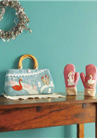 包包上的圖案設計是大野狼潛伏在樹木的後方,將小紅帽配置在另一邊。我經常將金色的珠珠裝飾在包包上,做出像是將糖粉灑在甜點上的感覺。