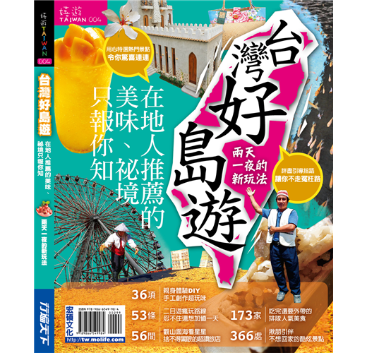 1.《台灣好島遊》以台灣四季做劃分:【繽紛春之旅】、【縱情夏之旅】、【恣意秋之旅】、【溫馨冬之旅】4大單元,總共規劃13項遊玩主題,53條兩天一日遊路線。