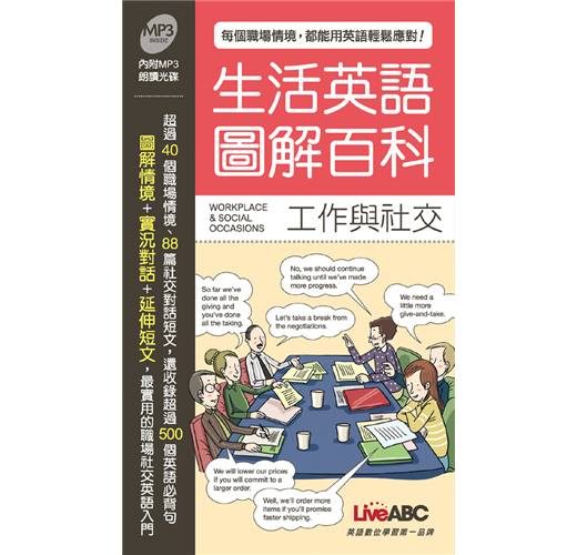 本書分為社交篇及工作篇,每一篇各分為22個單元主題,內容精挑細選了讀者在生活裡或工作上常會遇到的狀況情境。社交篇包含了自我介紹、打招呼、表達謝意與歉意、鼓勵與安慰、祝福他人、去唱歌吧、生日派對、陷入愛河、瘦身與飲食、上美容院等生活題材;而工作篇則細分為上班首日、客戶服務、業務拜訪、銷售產品、會議英語、記者會、閒聊八卦、升官慶功宴、討價還價、股票投資等商務單元。篇篇精彩有趣、實用豐富,絕對讓讀者愛不釋手。