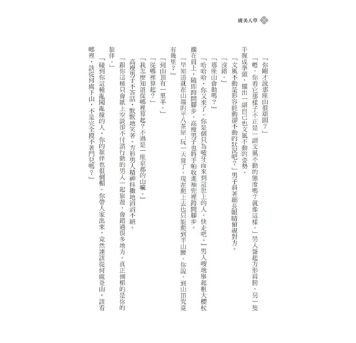 坐在一旁的孤堂老師沒有懷著特別重要的美夢。他捋著日漸泛白的下巴的稀疏鬍鬚正在回憶往事。往事躲在二十年前的深處,不輕易出來見人。遼闊紅塵中有東西在動。看不清到底是人是狗是木是草。當人的過去模糊得竟然連人狗草木都分辨不清時,過去才會成為真正的過去。人若是愈留戀無情拋棄了我們的昔日舊事,昔日舊事便會愈模糊,人狗草木全亂成一團。孤堂老師用力拉了一把蒼髯。