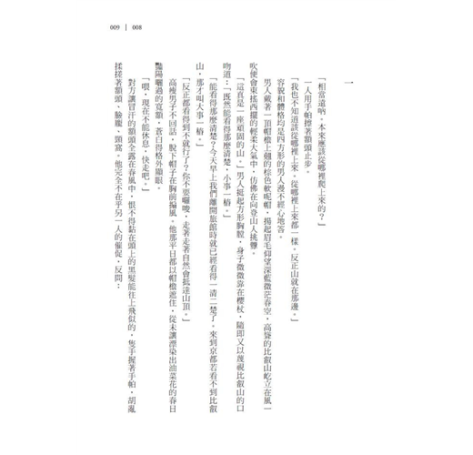 神代金雞 鼓起五百里羽翼於天空鳴叫時,峨峨雲層披垂下界,大虛中央浮出明朗的萬古積雪,以鎮壓關東平野的氣勢傾瀉而下,積雪往四面八方擴展,腰部以下埋沒於蒼茫中。白雪向天空誇耀般地往下流貫。連綿不絕地流瀉了一段後,分裂成幾條凌亂白線,斜切入紫藍山間的縐褶 。抬眼望向窗外的人順著在大地攀爬的雲影,抵達山腳的蒼蒼原野,再順著閃電般的蜿蜒深濃紫藍褶皺望向頂端的純白時,會豁然醒來。白雪吸引了明亮世界中的所有乘客。