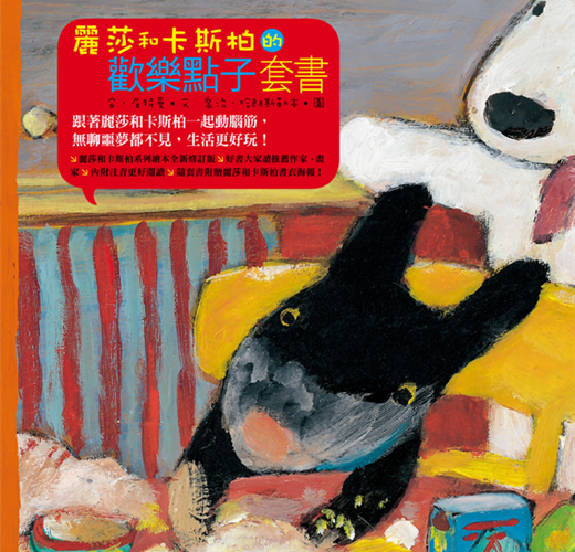 「麗莎和卡斯柏的歡樂點子套書」包含了《下雨天找樂子》(修訂新版)、《噩夢我不怕》(修訂新版)兩本繪本,主題是描述麗莎和卡斯柏運用想像力解決下雨天的無聊和做噩夢的恐慌。