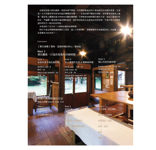 推開咖啡館的大門,邀請讀者一起走進:已有八十年歷史的木造懷舊咖啡館,每星期只營業一天、屋齡三百年的古厝咖啡館,還有開放自用住宅一隅、每星期只營業三天的咖啡館,以及供應店門前田地現採蔬菜及自家烘培麵包的咖啡館,二十多歲年輕人開設的小小藝廊咖啡館,附設淋浴間與置物櫃、支持「健康」與「夢想」的咖啡館……