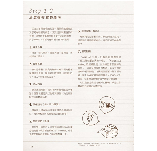 如果你對咖啡沒有燒到90 度的狂熱卻還是想開咖啡館,或是你想在優質的咖啡之外多點個人風格的呈現,讓客人對你印象深刻,那好,這本書鐵定可以給你很多這方面的想法。這本書將一些小巧有特色的咖啡館分門別類,讓你看到一家咖啡館除了咖啡之外還有什麼可能表現的手法,然後再加上可能的預算與計劃,保證你看完之後一定會有些想法。但是就算把這本書看爛了,你還是得參透這些美麗計劃後面的風格,進而得到獨特的自我品味才行,不然依樣畫葫蘆一切都是白搭。正如我最常對跟我學咖啡的學生說的:把我煮咖啡與烘焙咖啡的方法模仿到精,你不過是第二個我,只有思考自己想要什麼,並且不斷的去嘗試才能夠煮或烘焙出自己的咖啡,也才能說你會煮咖啡了。