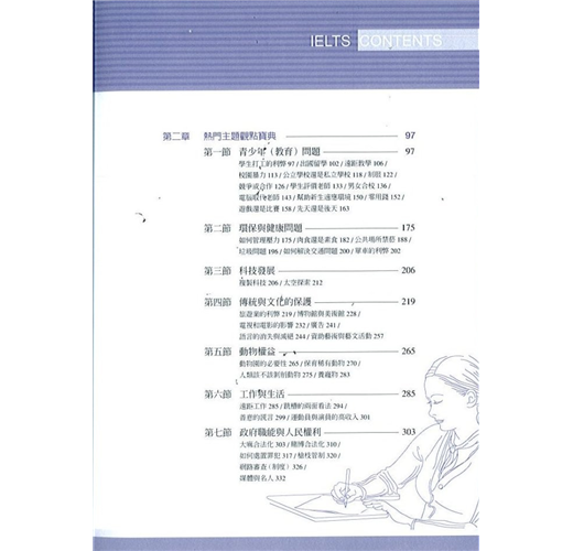 本書根據IELTS歷年寫作考題,總結出題的規律和範圍,把話題歸為七大類:(1)青少年(教育)問題;(2)環保與健康問題;(3)科技發展;(4)傳統與文化保護;(5)動物權益;(6)工作與生活;(7)政府職能與人民權利。以上話題的觀點、辭彙不僅可以提高寫作表達能力,還能拓寬思路。甚至,對於閱讀、聽力和口語都有幫助。