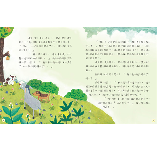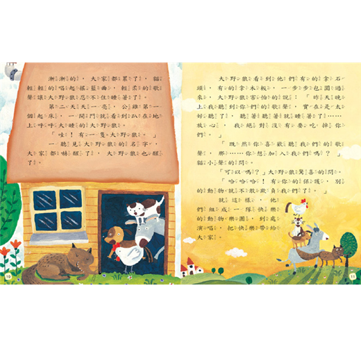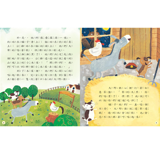 ‧想找快樂的驢子、傷心的老狗、迷路的貓、失業的公雞和一隻愛聽歌大野狼,組成了一隊動物樂團,到處演唱,你也想聽他們唱歌嗎?