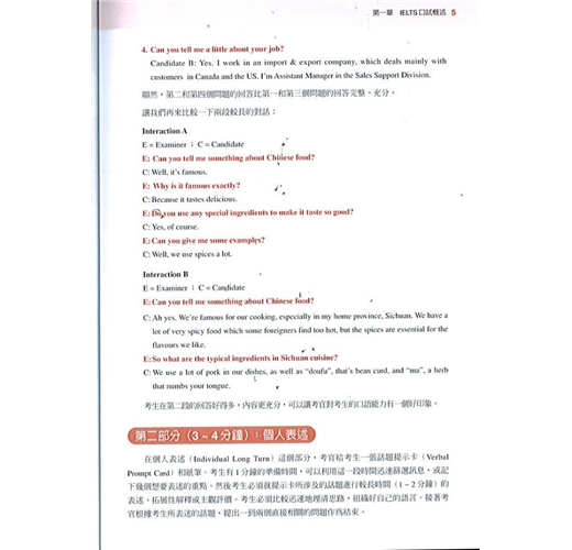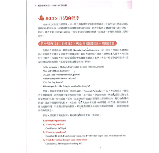 ◎ 第一章是IELTS口試概述,總體介紹IELTS口試的目的、程序、評分等級和IELTS口試的四個評量標準,著眼於讓考生通盤瞭解IELTS口試,做到心中有數。