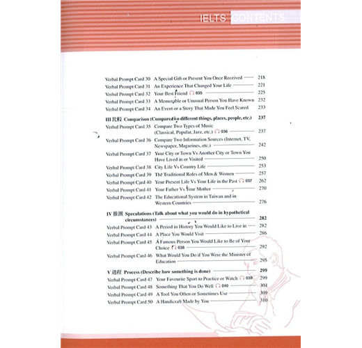 ◎ 第四章爲IELTS口試模擬訓練。「熟能生巧」是我們的信條。口語能力是訓練出來的而不是規定出來的。在本章中,本書作者有意識地按口試的程序爲考生提供具有普遍意義的試題情境訓練。在第一部分,彼此介紹幷談論一般性話題中,選擇了15個經典話題;在第二和第三部分,即個人表述和深入交談部分,則從溝通互動的角度,按描述現在(descriptions)、回憶過去(memories)、比較事物(comparison)、虛擬推測(speculations)和叙述過程(process)等五大語言功能,組織了50個典型的話題,供讀者反復練習。